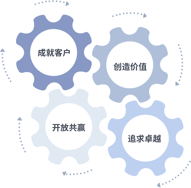 成就客户是一切决策的出发点,,,,创造价值是衡量所有工作的标准,,,追求卓越是我们做事做人的态度,,,开放共赢是我们的格局也是最终的结果。。价值观的齿轮环环相扣,,推动着组织里的每个人不断向前。。。