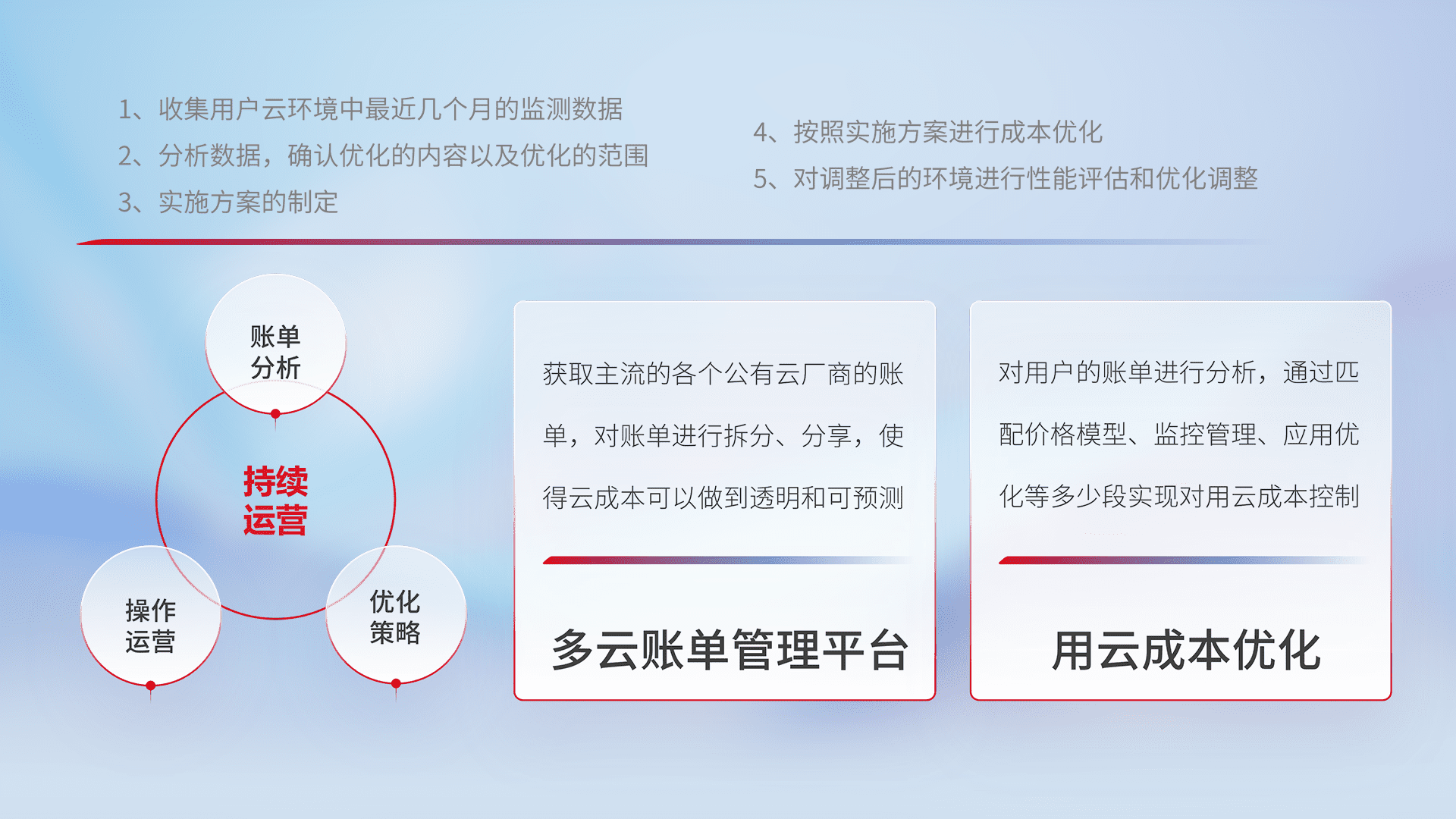 通过多云纳管,,以统一的资源数据模型把客户的云资源进行抽象和封装,,进而实现对多云资源的统一操作,,保障云资源管理的可靠性、、、稳定性与可用性。。。量身定制化运维内容,,,配置、、、开发运维、、、、补丁管理、、、、备份、、、监控、、、、认证和访问管理、、审计和日常巡检等,,,,保障在用云过程中的可靠度,,,稳定度以及高可用率。。